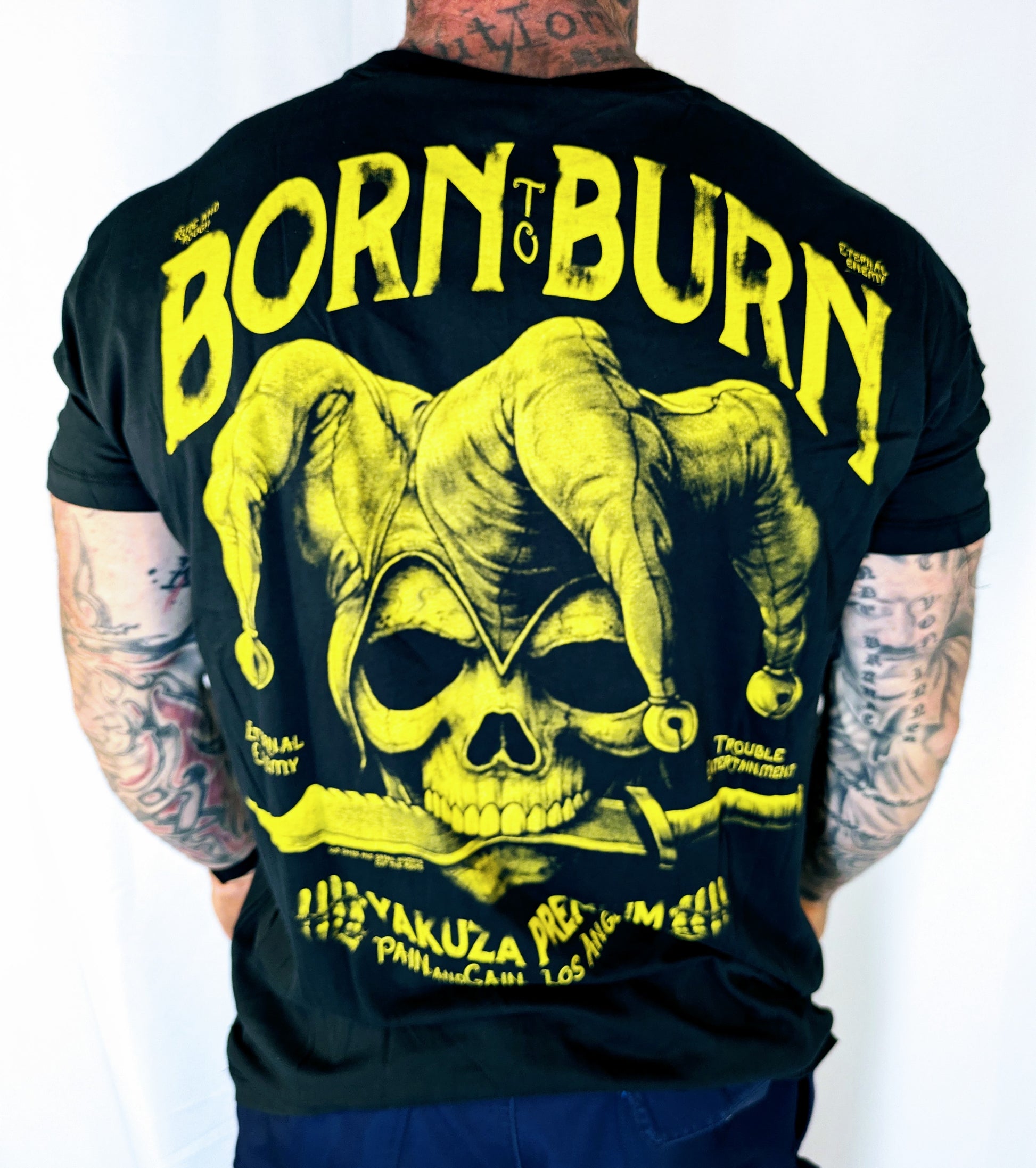 auf dem Rücken, abgebildet ist ein Harlekin mit Messer im Mund.